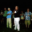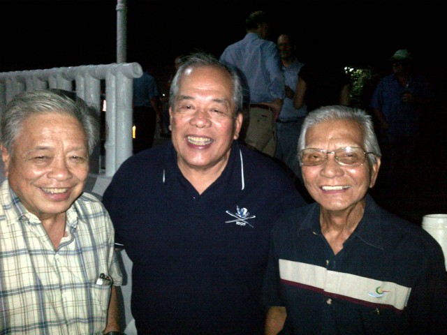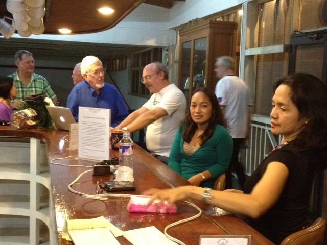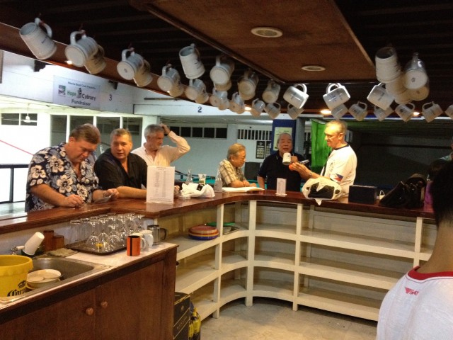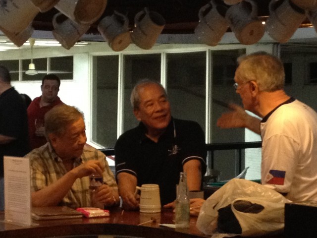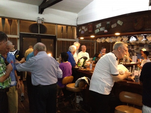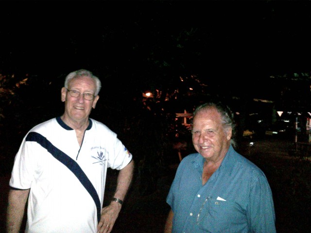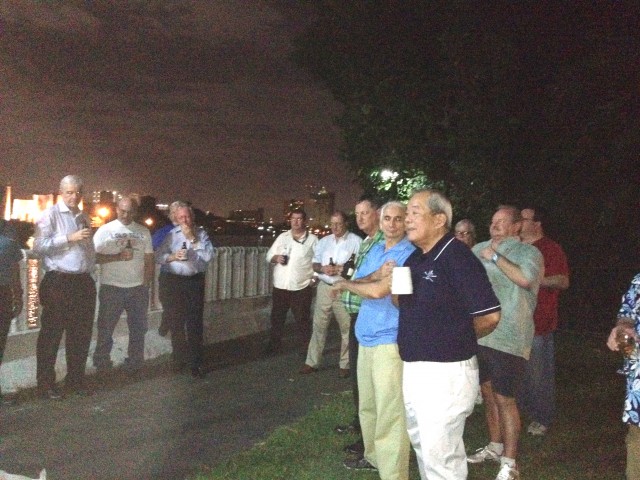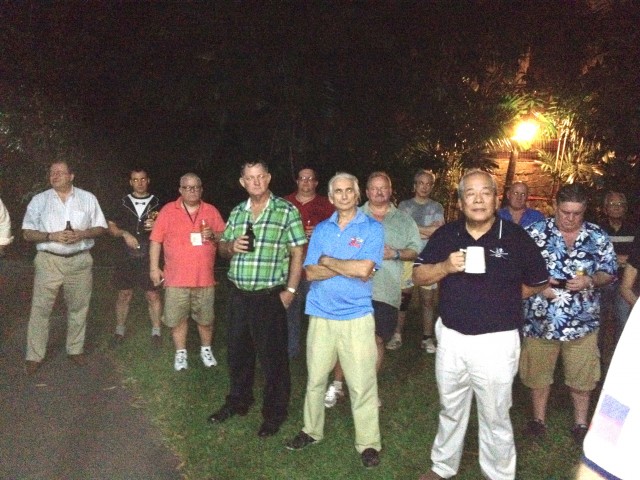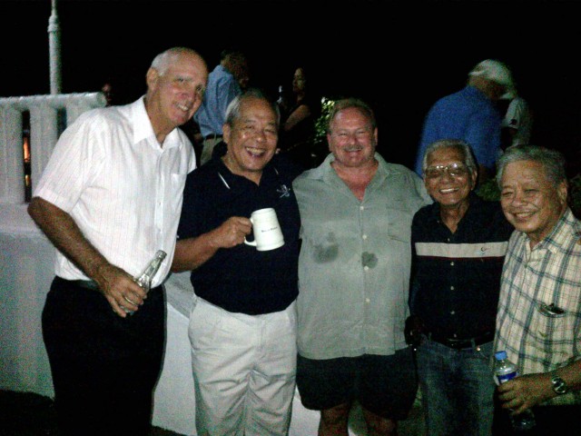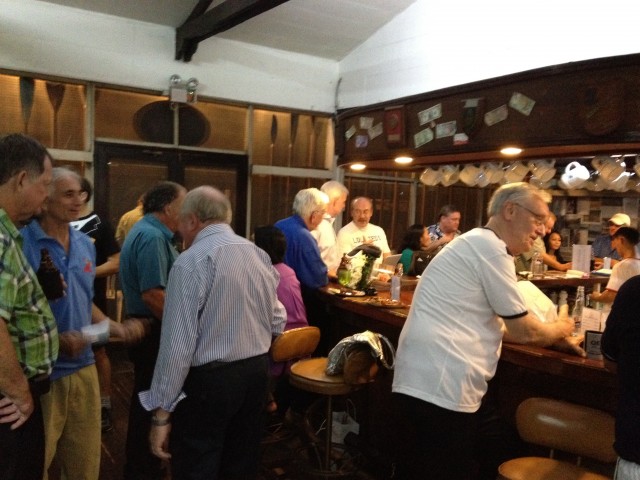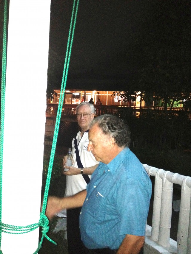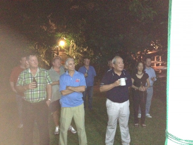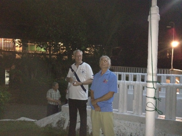 With a cool breeze blowing, many members of the Manila Boat Club and Manila Men's Hash House Harriers, met at the Clubhouse to swap memories of Ted and pay their respects. At 8pm precisely, the Last Post was played and the flags lowered from their half-mast position on the club flagpole. Steve Banta then said a few words to the assembly and this was followed by some words from Tom Crouch on behalf of MMH3/ Allan Burrell recited his wonderful poem form Ted's 60th run. Steve Banta then took the white wreath and cast it into the Ilog Pasig as a symbol of SVO Ted's last journey downstream. The Clubhouse bell was tolled 8 times to sy farewell and then all resumed the task of drinking to the memory of Ted and ensuring it was just the sort of evening he would have enjoyed.